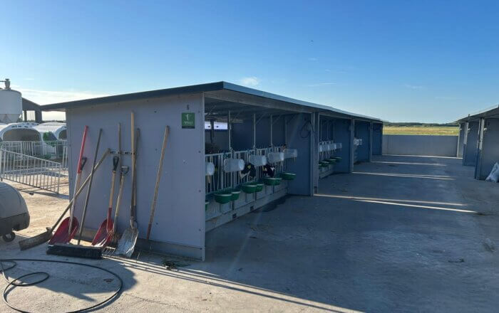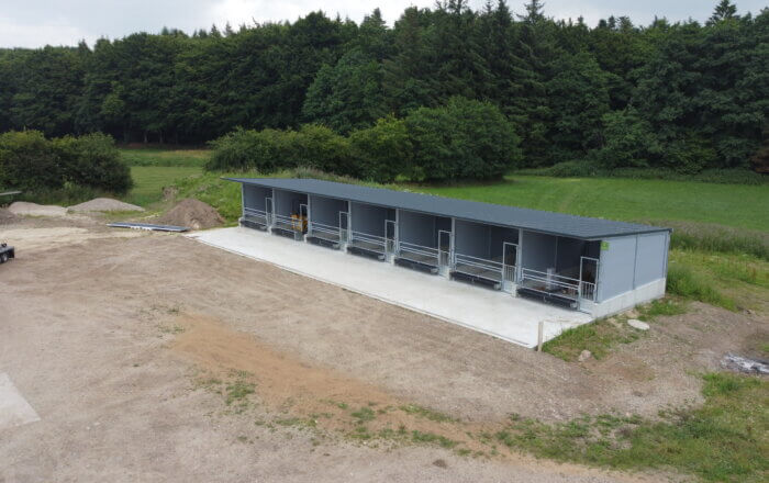 Levering van 10 Topcalf Quinto Kalverhutten in Denemarken, met flexibele groeps- en eenlinghuisvesting voor kalveren....