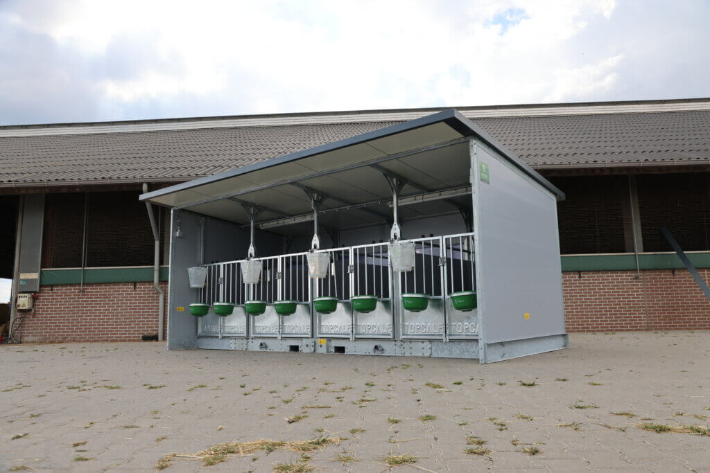 ✓ Bescherming tegen weer en wind – De verlengde zijwanden en de 1500 mm dakoversteek houden zowel de kalveren als de veehouder droog en uit de wind.