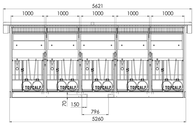 De Topcalf Quinto Kalverhut is een flexibele eenlingboxenstalsysteem. Met de uitneembare tussenwanden maak je eenvoudig een groepje van twee, drie, vier of vijf, waardoor de kalveren samen opgroeien en hun sociale gedrag ontwikkelen. De constructie, bestaande uit gegalvaniseerd staalwerk met kunststof (uitneembare) wanden, uitneembare roostervloeren en een geïsoleerd sandwichpanelen dak, is eenvoudig te reinigen en biedt een lange levensduur. Met een binnenwerks afmeting van (LxB): 1625×1000 mm per ligplaats voldoet de kalverhut aan de huidige Nederlandse regelgeving.